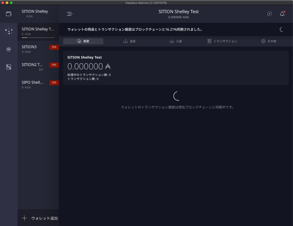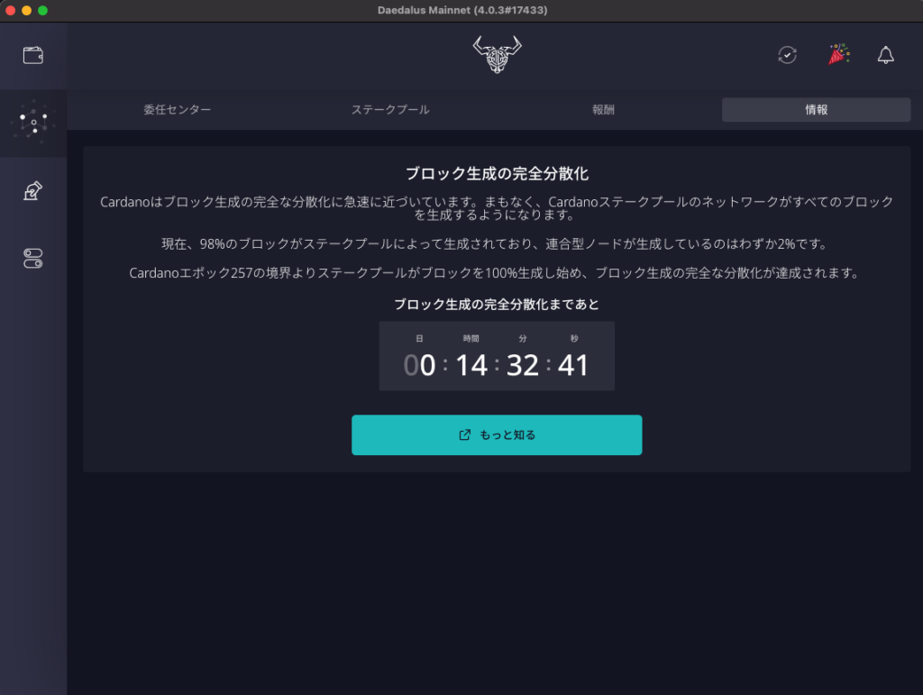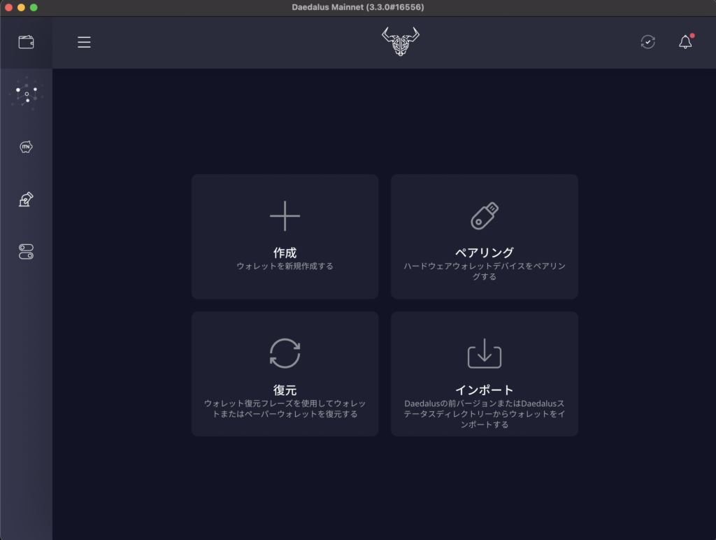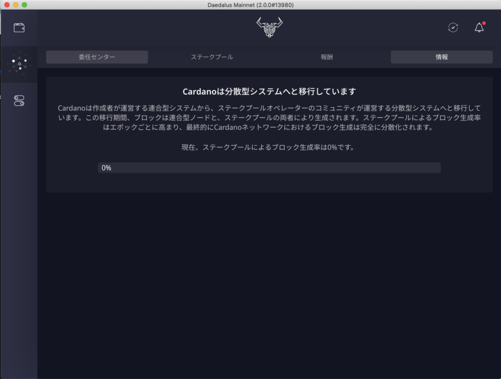 まず、最新のShelleyメインネット用ダイダロスを用意しましょう。ダイダロスは、フルノード対応でブロックチェーンのブロックデータをローカルコンピュータに保存し、常にカルダノのブロックチェーンと同期します。*操作する以外やステーキングで委任した後は常にダイダロスを開いておく必要はありません。