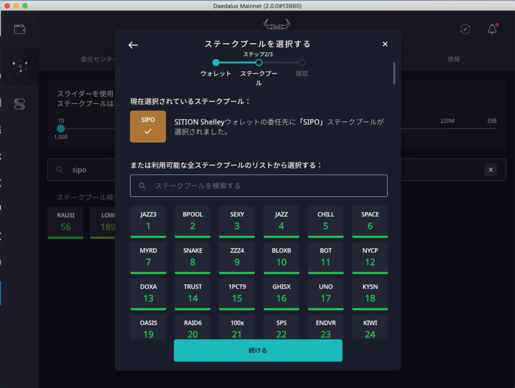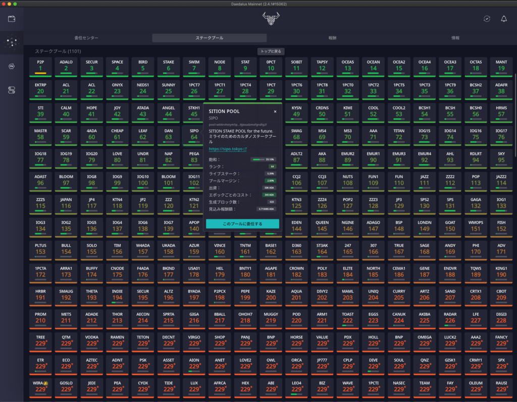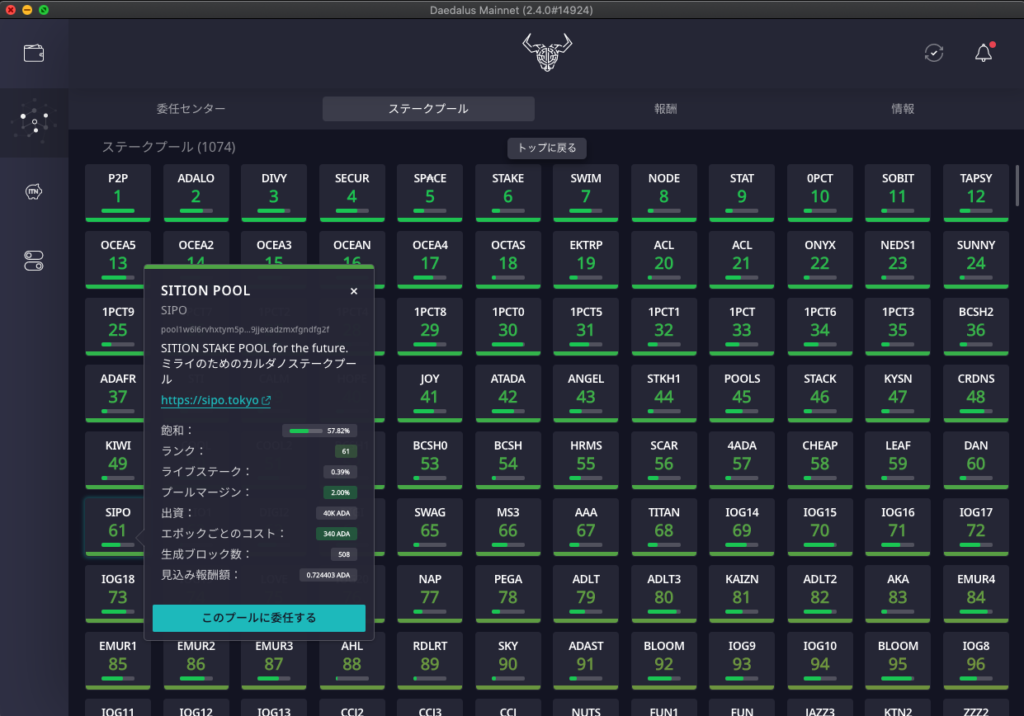 また、ステークプールリスト表示画面には、委任中のステークプールが表示されるようになりました。