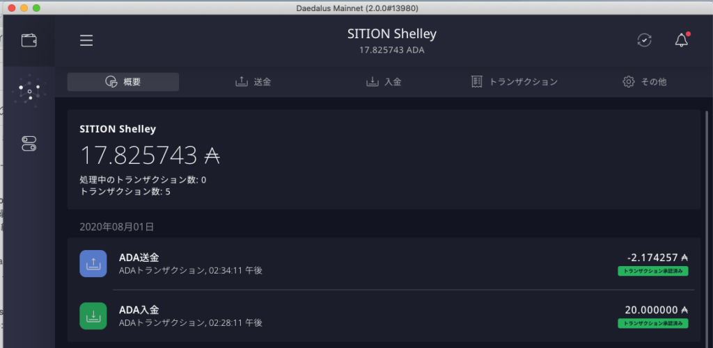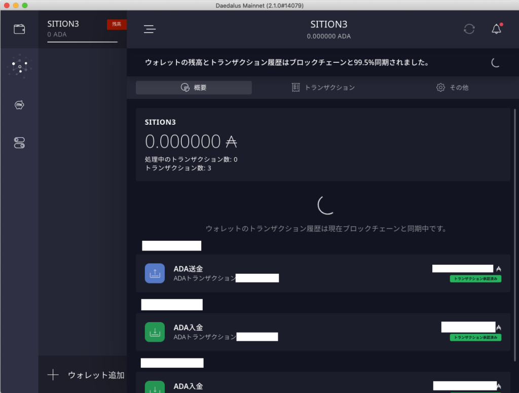 同期が完了するとウォレットに保有されているADAが表示されます。これで復元成功です。