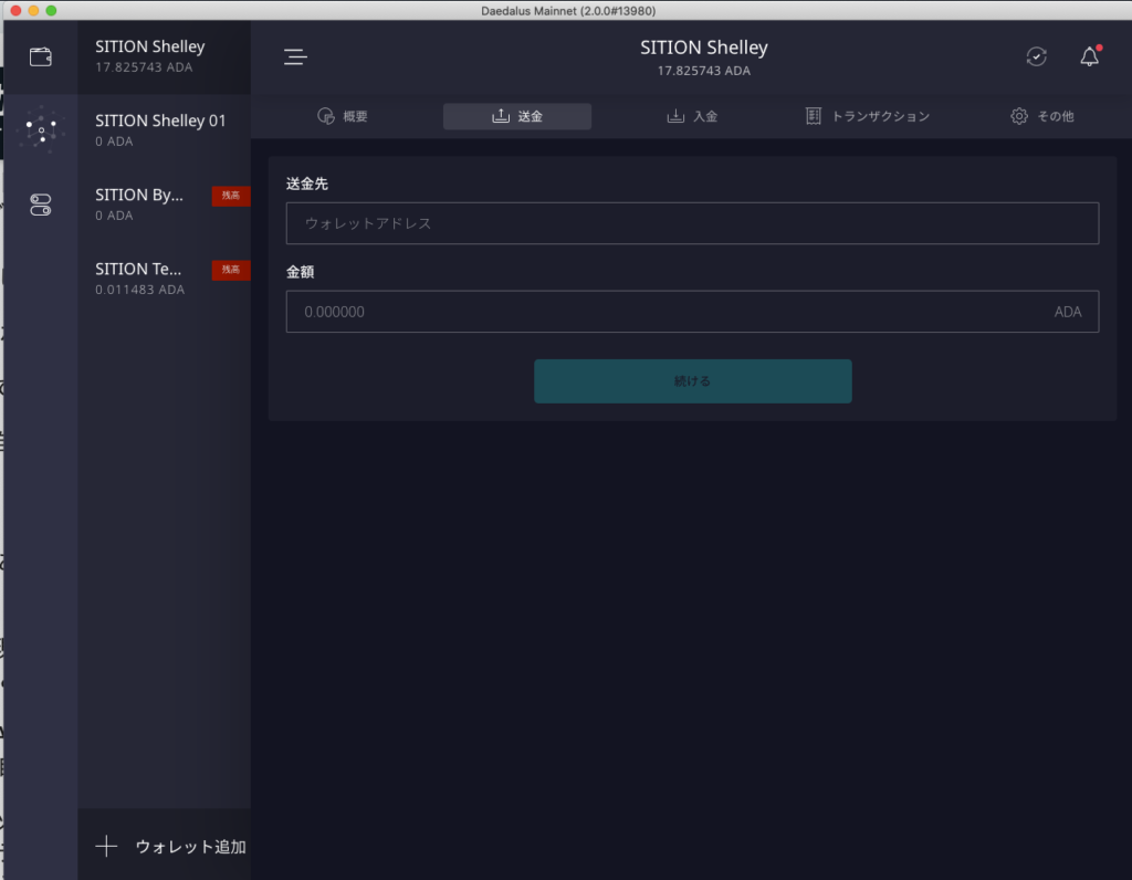 このときByron用のウォレットを復元した場合は、最新のシェリーメインネットでは使えません。次に新規で最新のシェリーメインネットで使用できるウォレットを作成し、そこに今復元したウォレットのADAを移します。Shelleyウォレットを復元した場合は、そのまま使用できます。