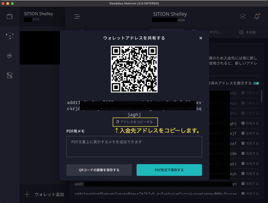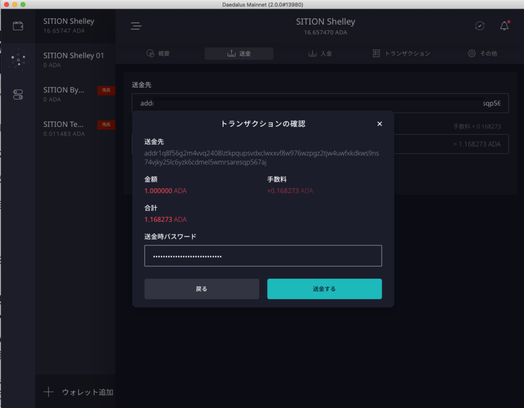 *「送信パスワード」は、後で新規に作るウオレットや他のウォレットにADAを移す時に必要になります。
