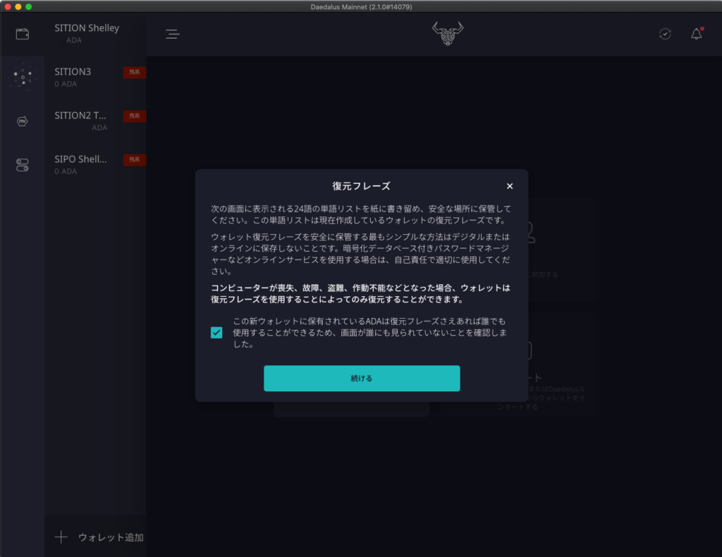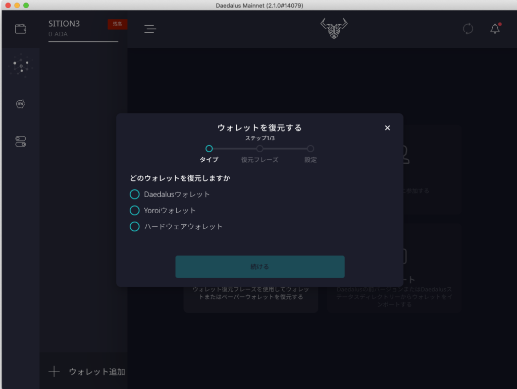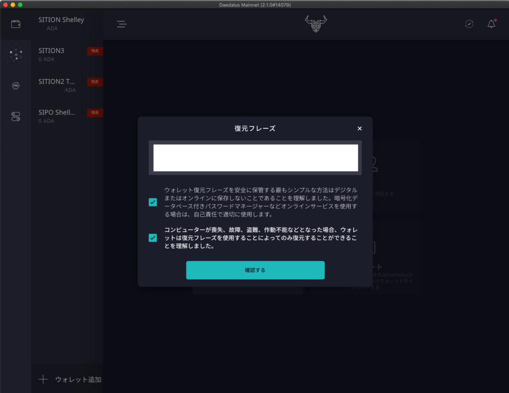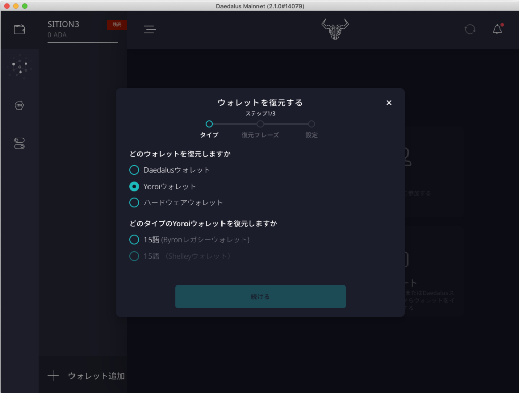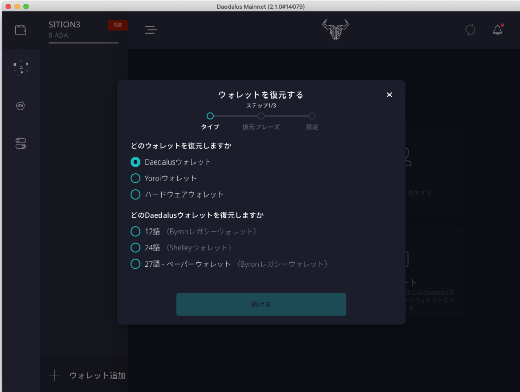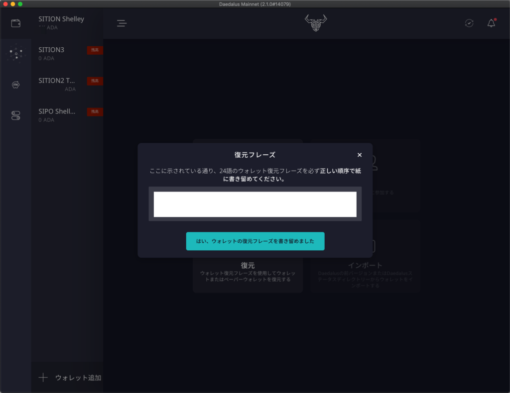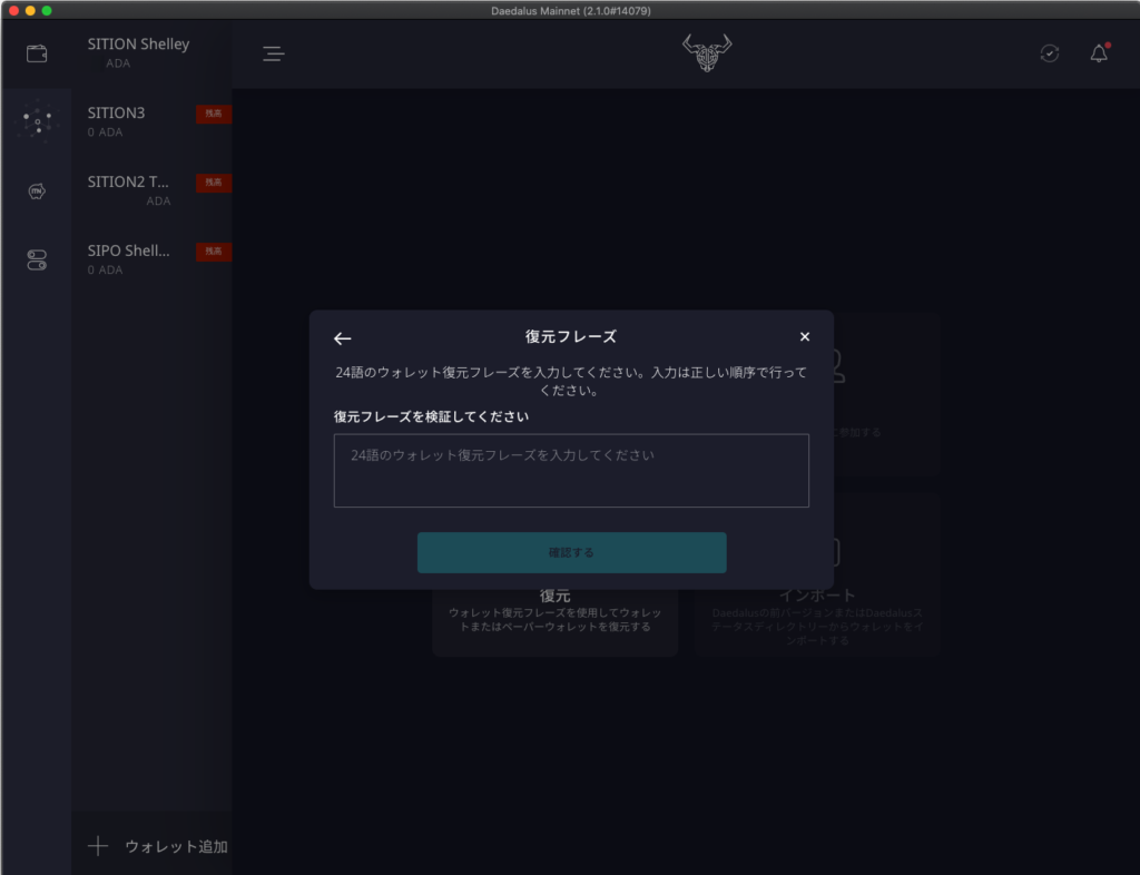 まず最初に、12〜15語のパスフレーズの古いダイダロス用のウォレットやヨロイのADAを最新Shelleyメインネット用ダイダロスで復元します。