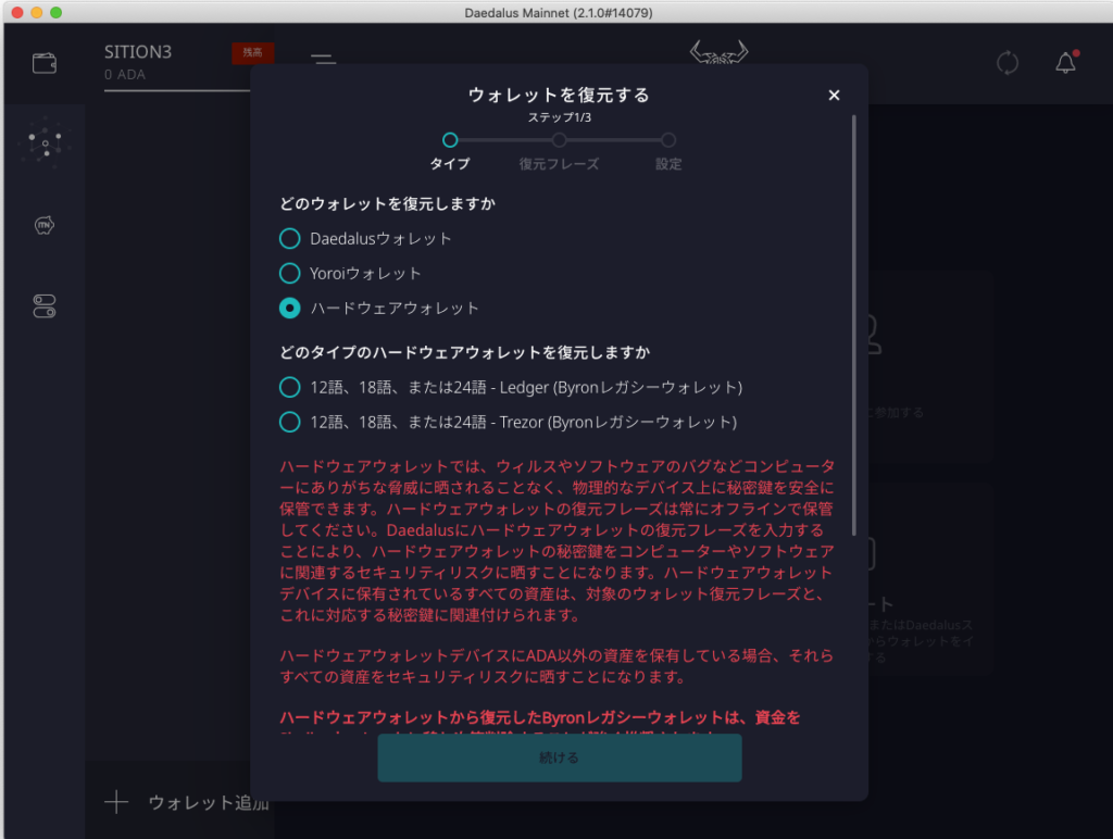 最新のメインネット用ダイダロスウォレットは、Byron時代の12語〜15語のパスフレーズのウォレットのADA、ヨロイのADA、ITNの報酬のADA、Shelleyの新しいウォレットのADA、ハードウェアウォレットのADAなど、これまでの全てのウォレットのADA簡単に復元できるようになっています。