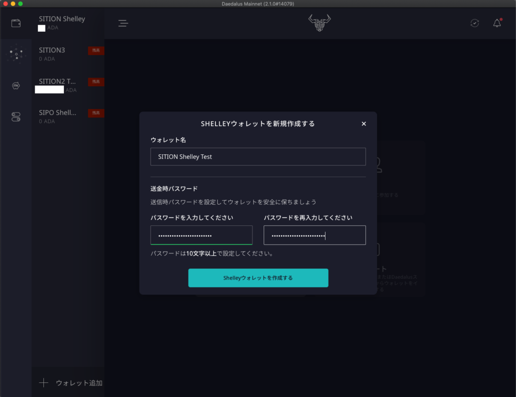 次にShelley(シェリー)用のウォレットの「ウォレット名」と送金時に使用する「送信パスワード」を新規で10文字以上で入力してください。「送信パスワード」はADAを送金する時に使用します。必ず保存しておいてください。入力し終わったら、「Shelleyウォレットを作成する」をクリックしてます。