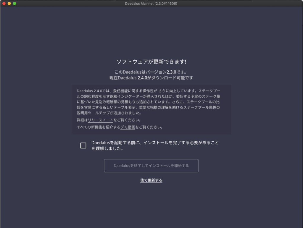Daedalus 2.3.0リリース以降では自動更新機能を配信。今後Daedalus更新インストーラーを手動でダウンロードする必要がなくなりました。