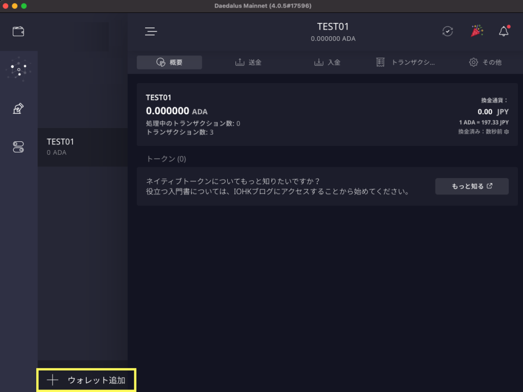 ダイダロスをインストールした状態で、最初に、左下にある「+ウオレット 追加」ボタンをクリックします。