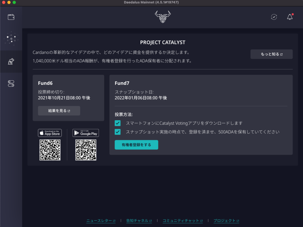 Cardanoメインネット用Daedalus 4.5.0は、投票画面のレイアウトを改良し、Catalystプロジェクトとフッターのリンクに継続登録を追加しました。この更新ではさらに、プールの過剰飽和警告も追加されました。