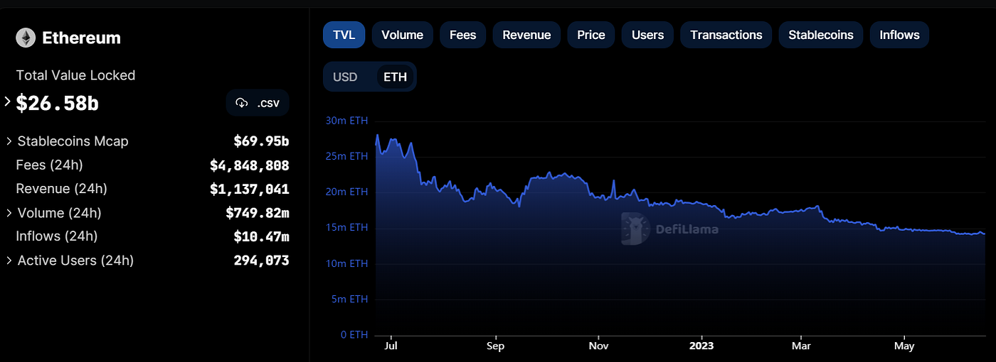 Cardanoの印象的なTVL成長に対して、EthereumはTVLが大幅に減少し、同じ期間内に25.58M ETHから14.25M ETHまで急落し、44.29%の減少を記録しました。Ethereumの減少の正確な理由は完全には理解されていませんが、高いガス料金、失敗したトランザクション、およびSolidityスマートコントラクト言語のセキュリティの脆弱性などの要因がこの下降トレンドに影響した可能性があります。