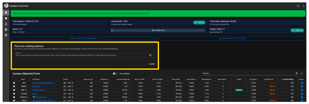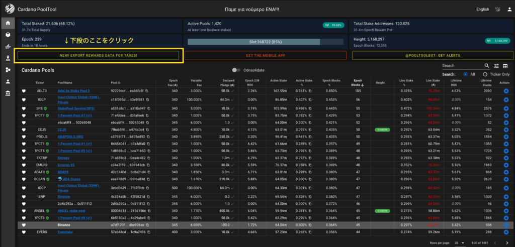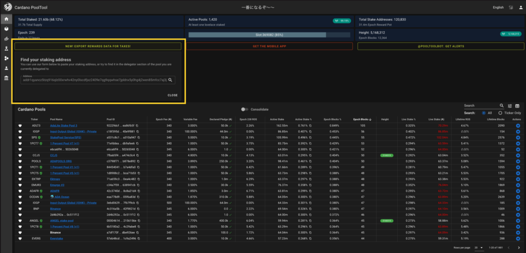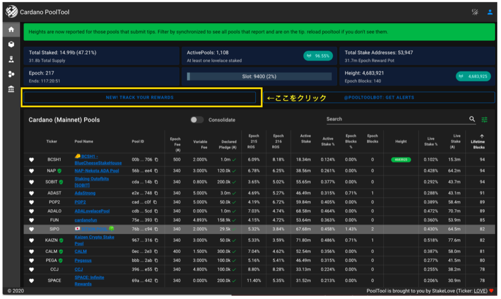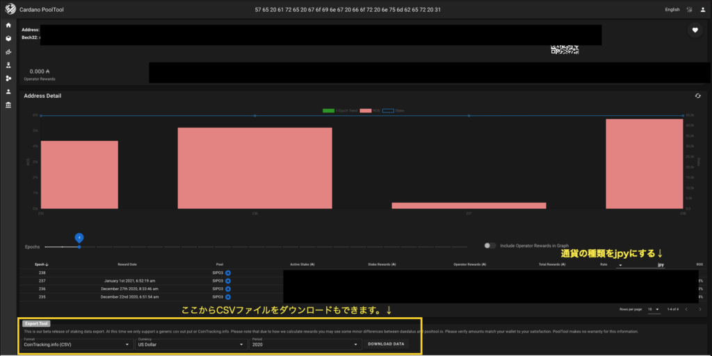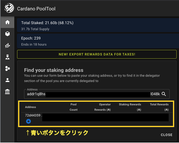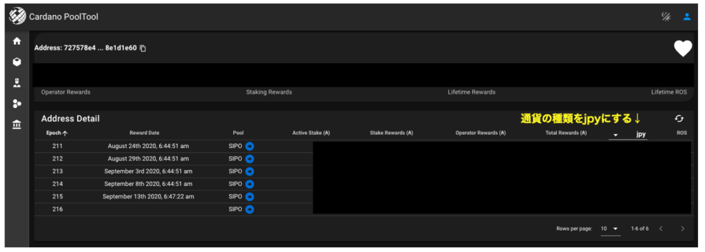 *「Pooltool.io」のサイトが仕様が更新され、アカウントを新規作成し、ステークしているアドレスを紐付けしないと、報酬履歴が表示されなくなりました。そこで「Pooltool.io」サイトでのアカウントを新規作成方法と表示のさせ方、また「Adapools.org」での報酬の確認の方法を別ページにマニュアルにしましたのでご確認ください。