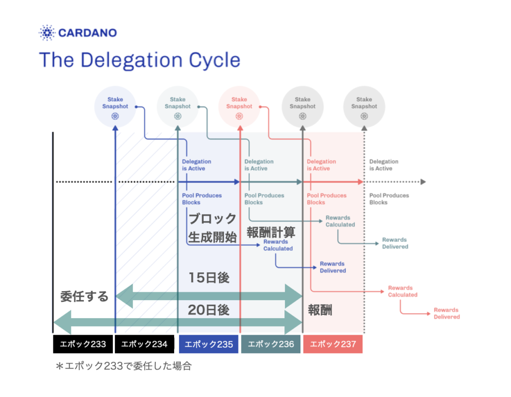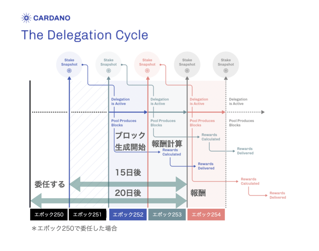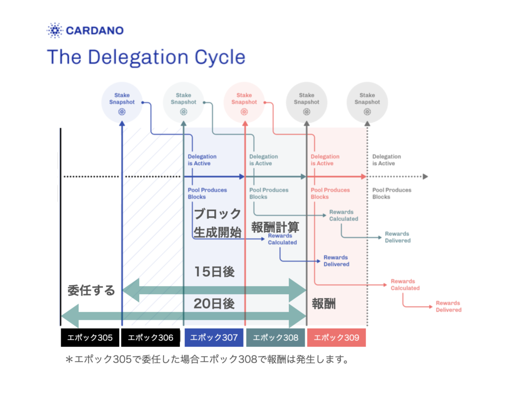 毎回エポックの最初に、二つ前のエポックの委任量とブロックの生成数に対して報酬が発生します。