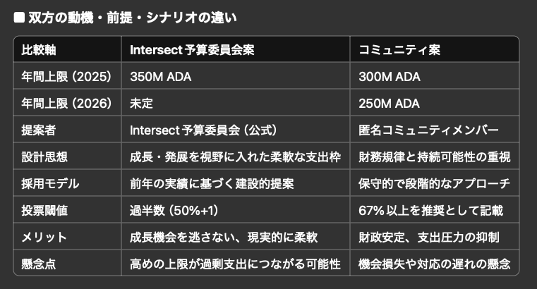 これらの提案はどちらも、カルダノ憲法に基づく「責任ある財務管理」という価値観を共有しています。両者の違いは、成長への投資と財政的保守主義のバランスをどう取るかという点にあります。