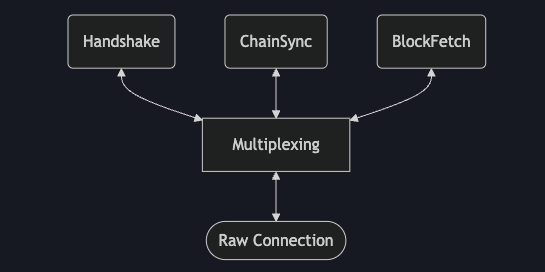 カルダノのノードは、複数のMini-protocol(小型プロトコル)によって通信を行います。Blueprintでは、これらがどのように構成され、どのようにMultiplexerを通じて共有されるかが明確に図解されています。