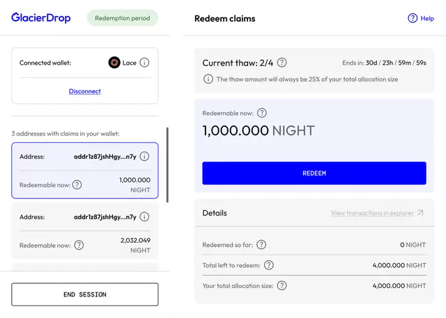 Thawingとは、Glacier DropおよびScavenger Mineの請求フェーズで割り当てられたNIGHTトークンが、360日間にわたり25%ずつ段階的に解除されるプロセスを指します。4回のアンロックで100%が償還可能になります。