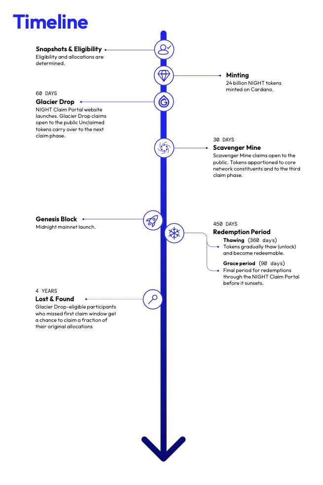 Glacier Dropは、Midnightが最初に展開するNIGHTトークン配布フェーズです。特長的なのは、特定のチェーンにおける過去の保有実績に基づいて、無料でトークンを請求できる点です。