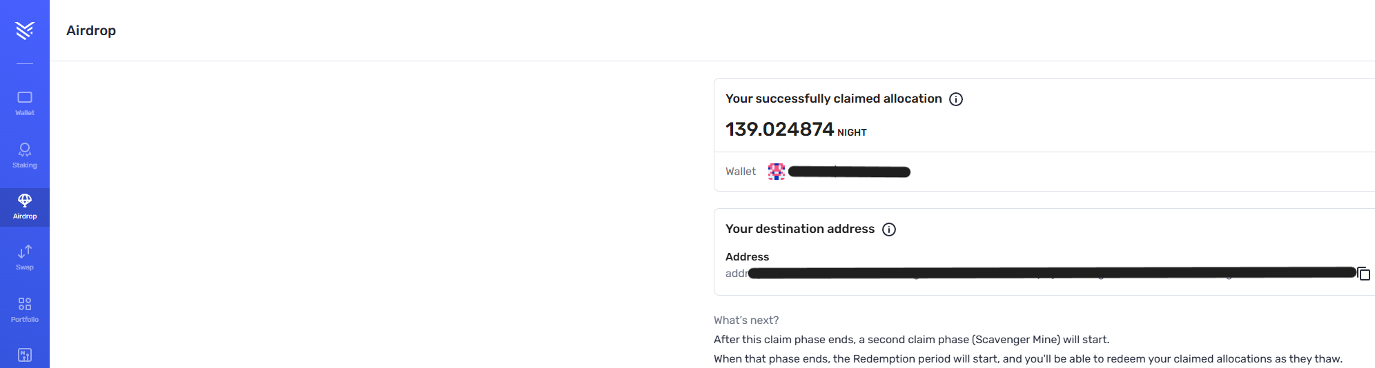 - 回答:Claimした時点ではNIGHTはロックされており、すぐには届きません。Redemption期間に**段階的に解凍(Thaw)**され、解凍のたびに「Redeem」操作で受け取る必要があります 。