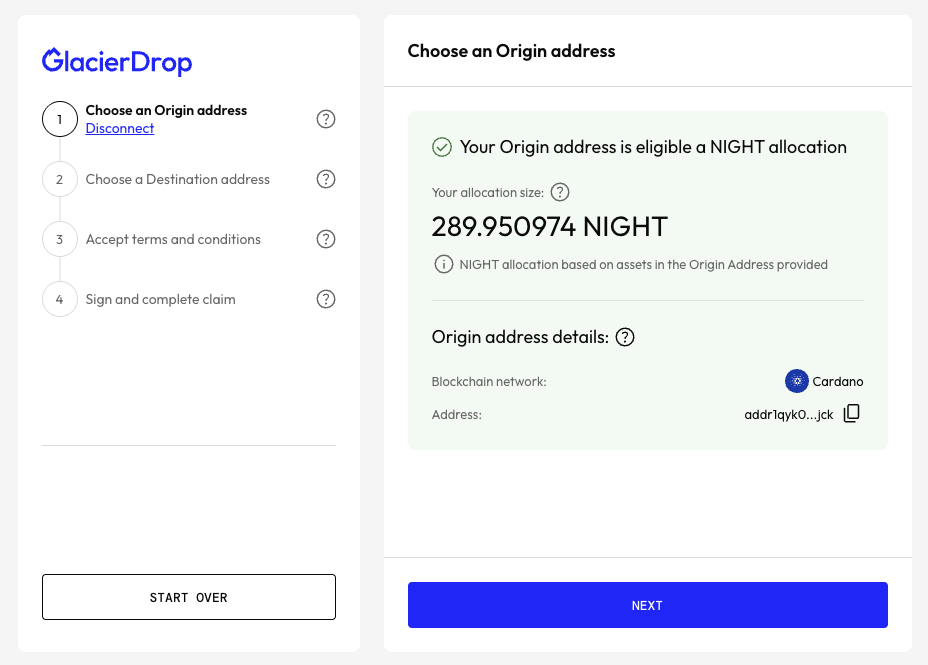 - Claim Portalで請求 ブラウザ(PC推奨)でNIGHT Claim Portalへ。 Originに“元のウォレット”を接続/指定し、Destinationに未使用のCardanoアドレス(受け取り先)を入力→規約同意→署名→完了。請求手順の詳細は公式ガイドを参照してください 。
