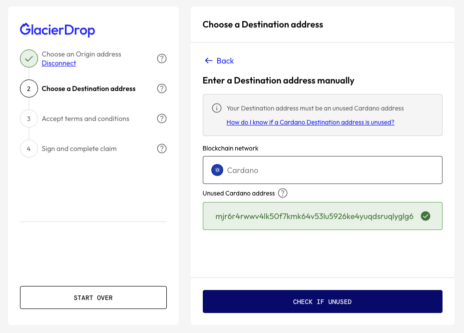 ・Destinationは未使用のCardanoアドレス必須。ウォレット接続なら未使用アドレスを提案/検証できます 。