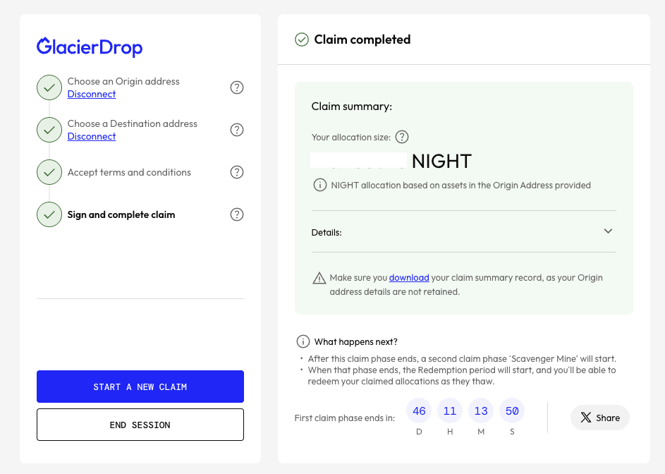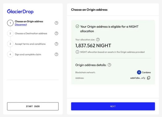*MidnightのNIGHTトークン配布イベント「Glacier Drop」ですが、クレーム期間が延長され、終了日は10月20日までになりました。