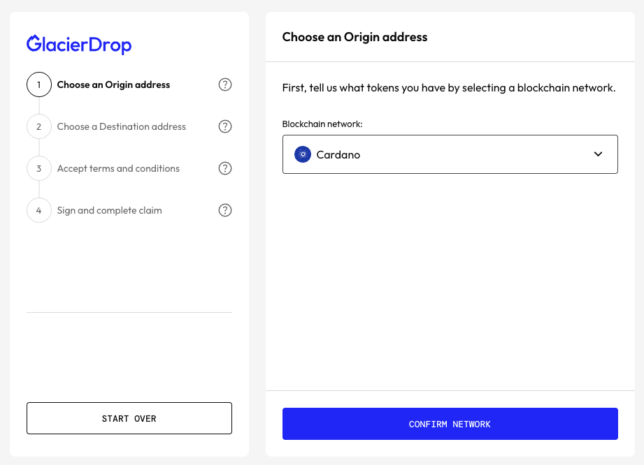 - Blockchain Network『Please select a blockchain network』から対象となるチェーン(ADA/BTC/ETHなど)を選びます。ここではCardanoを選び、「CONFIRM Network」をクリックします。