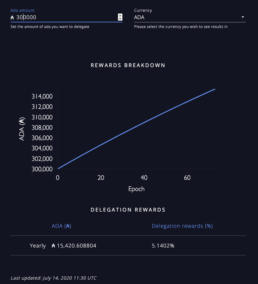 すると入力するだけで、グラフの下に「Yearly = 年間に獲得できる報酬」と、その横に「Delegation rewards(%)」が表示されます。とても簡単ですね。
