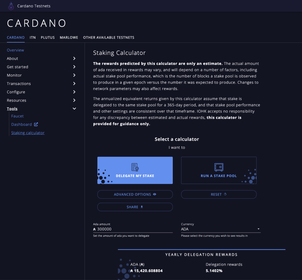 ちなみに右の「RUN A STAKE POOL」は、ノード管理者が得られる報酬計算機です。