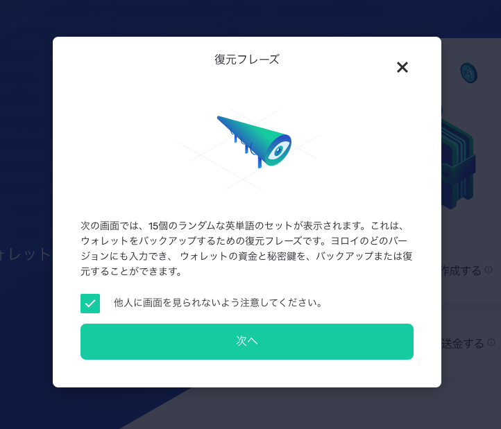 ここで15語のパスフレーズを書き留めて、厳重に保管しましょう。書き留めたら「次へ」クリックします。