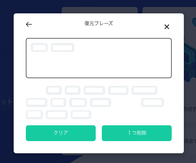 下記の画面が表示されたら書き留めたパスフレーズの順番に、該当する単語をクリックして入力してください。