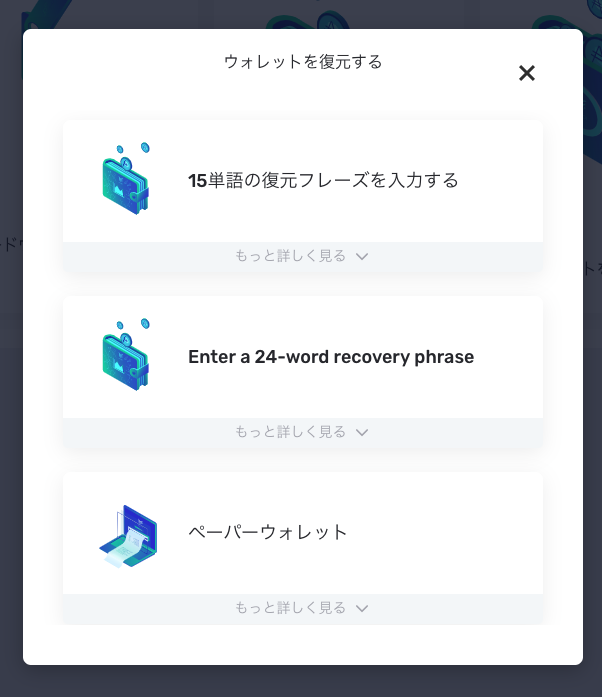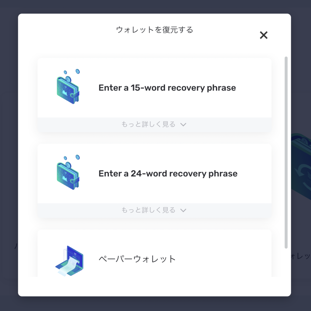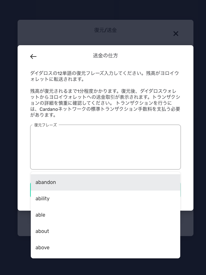 ここでは、ダイダロスの24語のパスフレーズウォレット(Shelleyバージョン)を復元します。基本的には上記の方法と同じですが、ダイダロスで管理しているウォレットをヨロイでも管理したい場合にはこの復元を行います。また、15語のパスフレーズ(復元フレーズ)のヨロイウォレットを復元する場合もほとんど同じ方法になります。