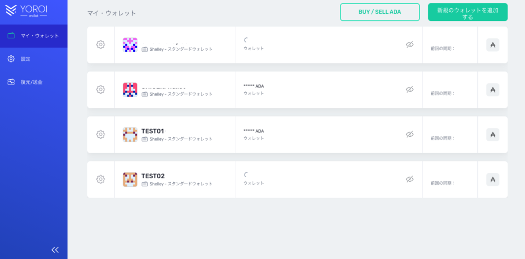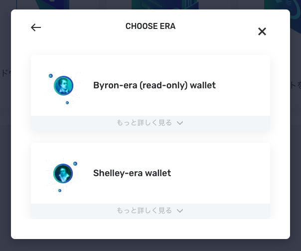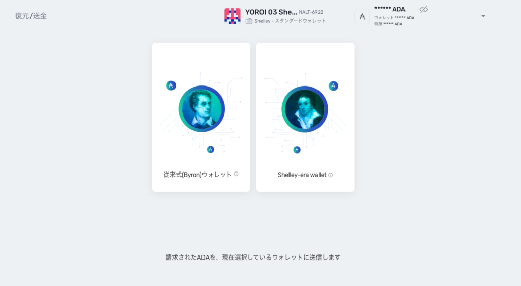 古いByron時代のウォレットをShelley対応に変換するには、Byronウォレットを一度「復元」するか、「復元/送金」機能を使って送金する必要があります。また、新規作成でShelley用のウォレットを作成し、復元したByronウォレットのADAを移す必要があります。