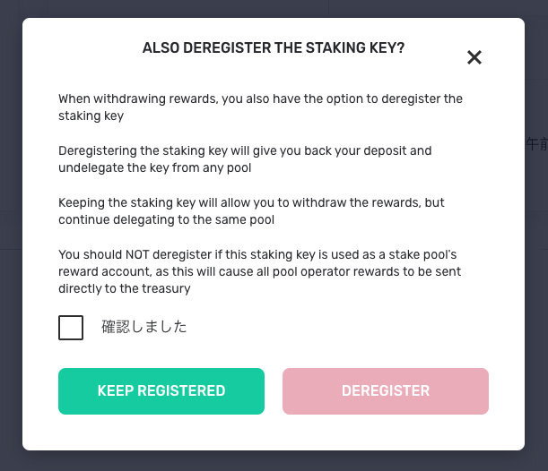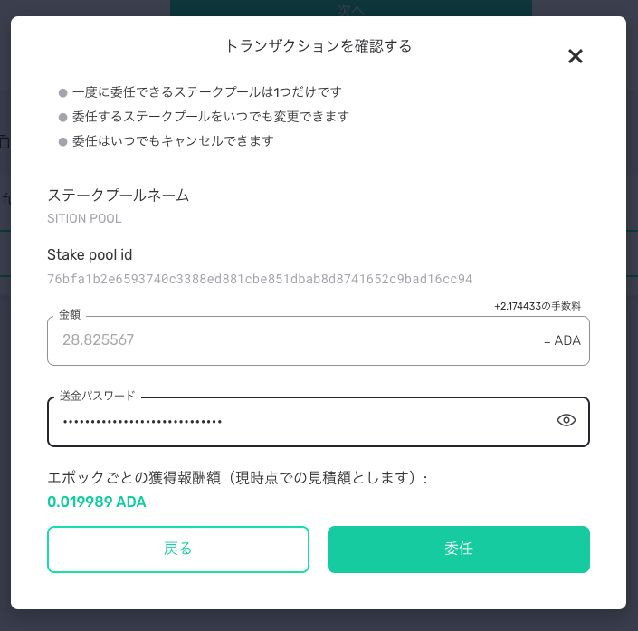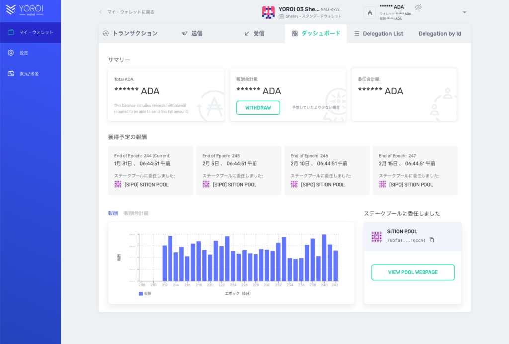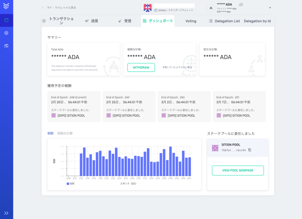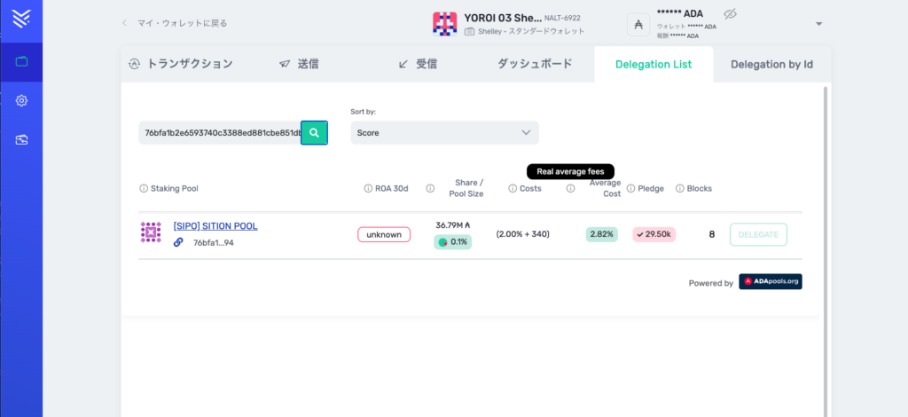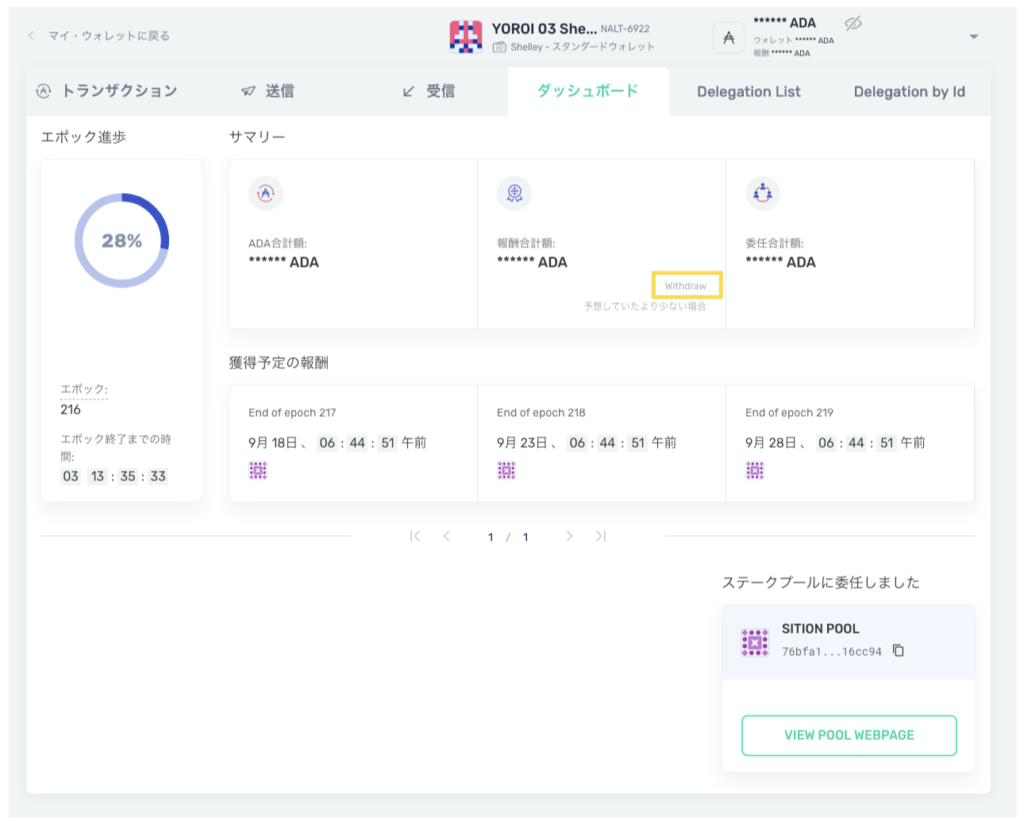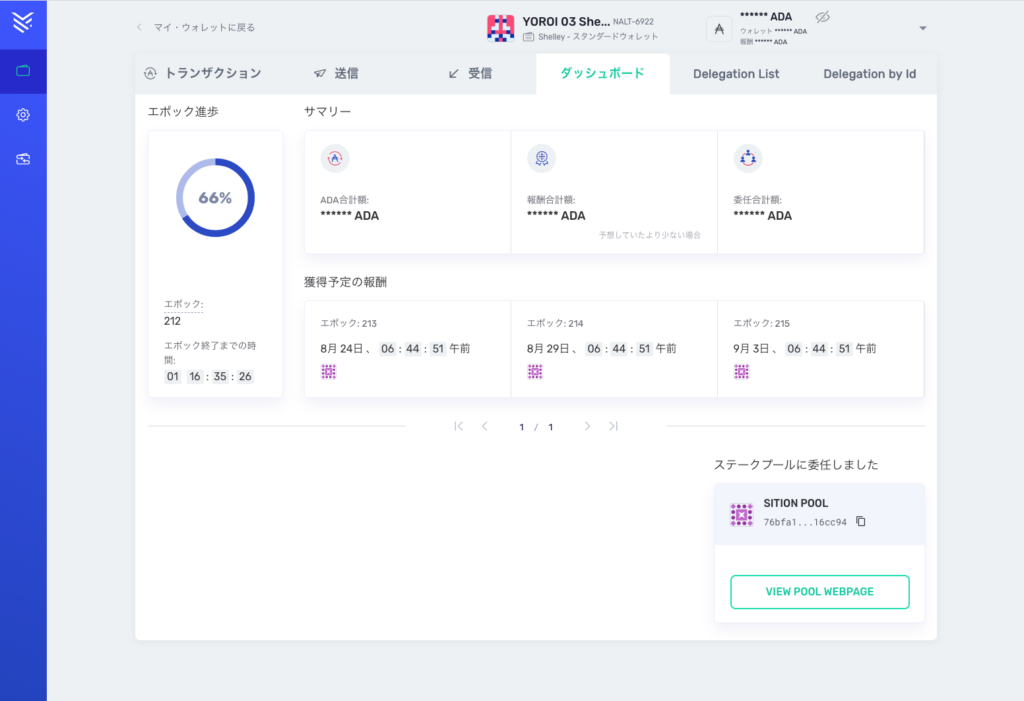 画面右側には、ユーザーが委任しているステーキングプールが表示されています。