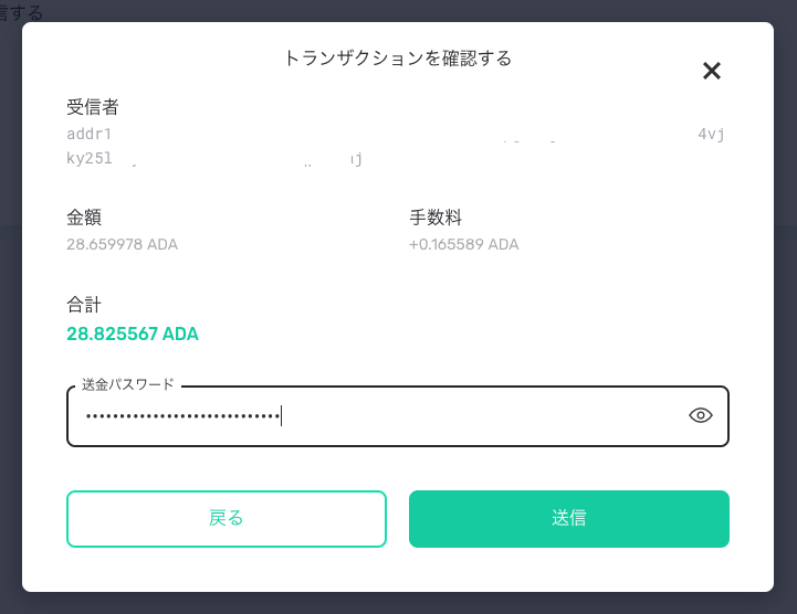 トランザクションをクリックすると、通常はそのトランザクションの詳細が表示されます。これには、送金先アドレス、トランザクションID、使用された手数料などが含まれる場合があります。