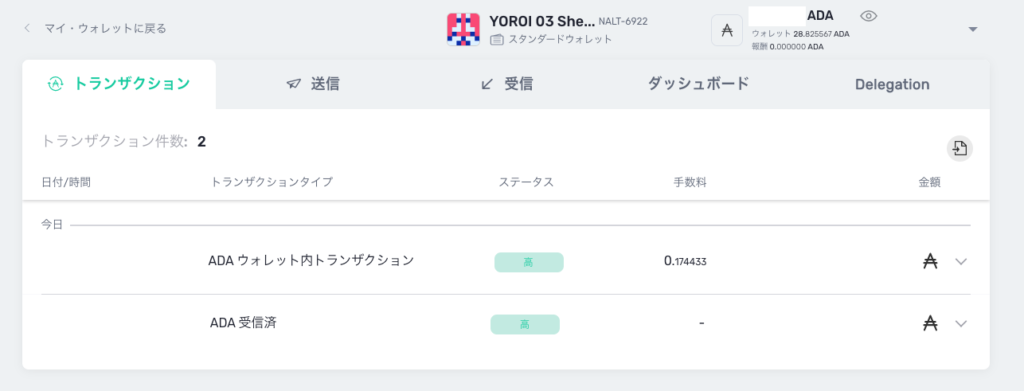 各トランザクションは時刻、タイプ(例: ADA送金)、ステータス(例: Submitted、Confirmed)、金額が表示されます。