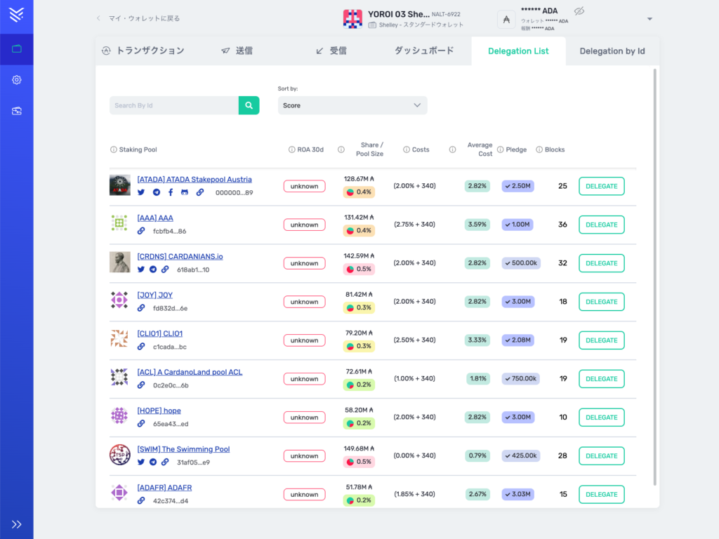 検索が完了し、お目当てのプールが見つかったら、リストされたプールの右端のボタン「DELEGATE」をクリックします。