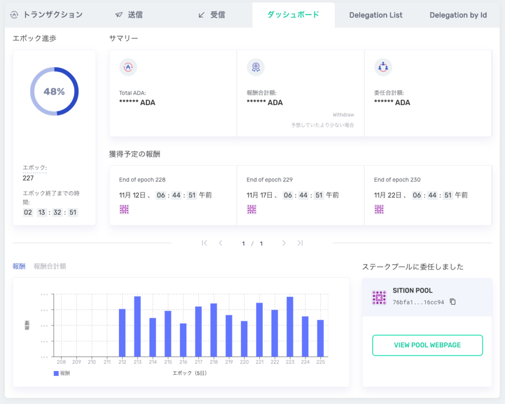 カレントエポック、エポックの開始日時、終了日時が表示され、ステーキングの現在の進行状況を追跡できます。