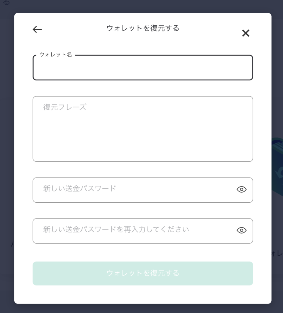 - Password(パスワード): ウォレットへのアクセスを保護するためのパスワードを設定します。