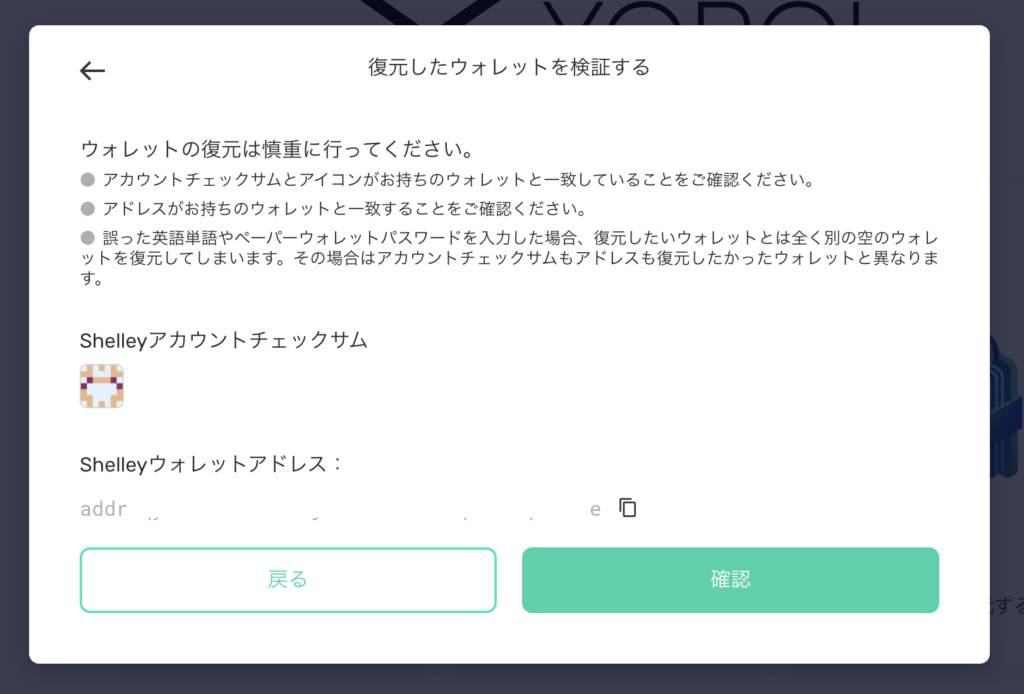 またダイダロスの24語のパスフレーズウォレット(Shelleyバージョン)復元した場合は、ダイダロスの24語のパスフレーズはそのまま紛失しないように厳重に保管してください。復元するときに必要となります。(*ヨロイで新規でウォレットを作成する場合は15語のパスフレーズでの管理となります。)