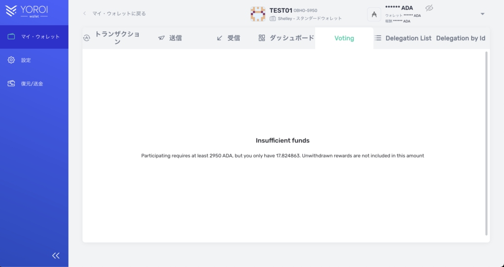 「Voting」タブは、ヨロイウォレットに組み込まれた投票機能に関するものです。これは、カルダノエコシステム内でのコミュニティ主導の意思決定プロセスに参加するための機能です。カルダノのガバナンスモデルでは、ADAホルダーはプロジェクト提案や改善について投票することで、エコシステムの将来に直接影響を与えることができます。